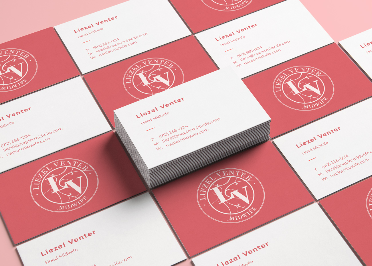 Logo | Business Cards | LetterheadAs you can tell from the last name, this was a project for my mum who is a midwife. She wanted a logo represented her as classically ladylike. We avoided the cliches of typical Midwifery logos of a mum holding a tummy. We decided on a stamp design, something you imagine in a old hotel. The added vines around her initials were added to give some visual interest, while the weight of the initials keep these from being distracting.